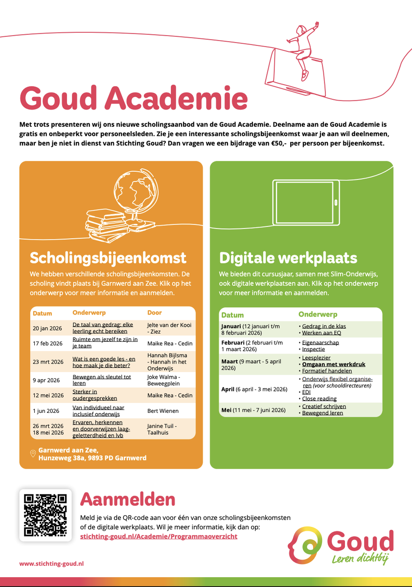 Deelname aan de Goud Academie is gratis en onbeperkt voor personeelsleden. Zie je een interessante scholingsavond waar je aan wil deelnemen, maar ben je niet in dienst van Stichting Goud? Dan vragen we een bijdrage van €50,- per persoon per scholingsavond.